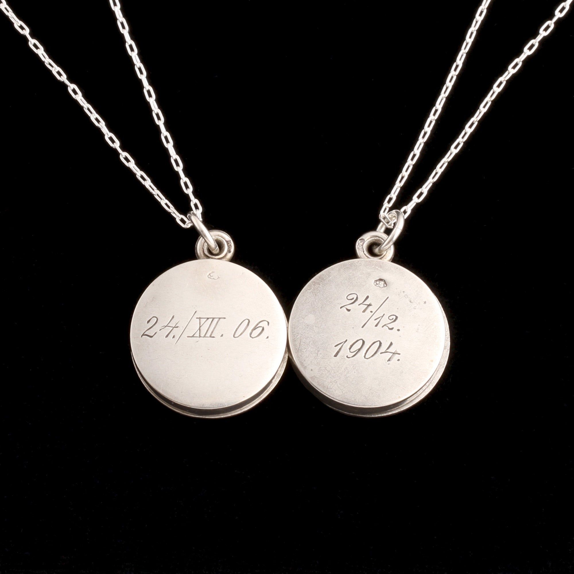 one locket is engraved with the year 1904, the other is engraved with 1906