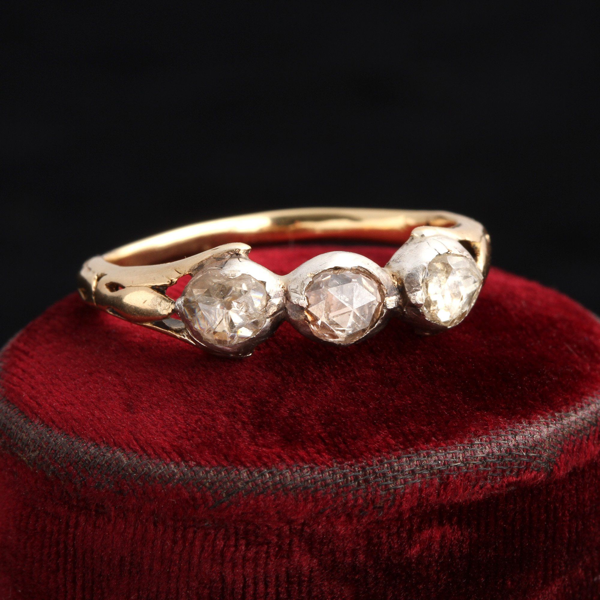 This covetable Georgian era ring is fashioned in buttery yellow gold and silver with elegant split shoulders and a trio of rose cut diamonds in rub-over settings. The standard treatment for gemstones in the Georgian period was to mount them in closed settings and back them in foil. This distinctive style of stone setting is a hallmark of Georgian jewelry, but it requires the wearer to take a little extra care - it's best to remove this ring (or any ring with closed settings) when showering or washing dishes, because the settings are closed they can trap liquid which may cause the foil backing beneath the stones to oxidize and darken.