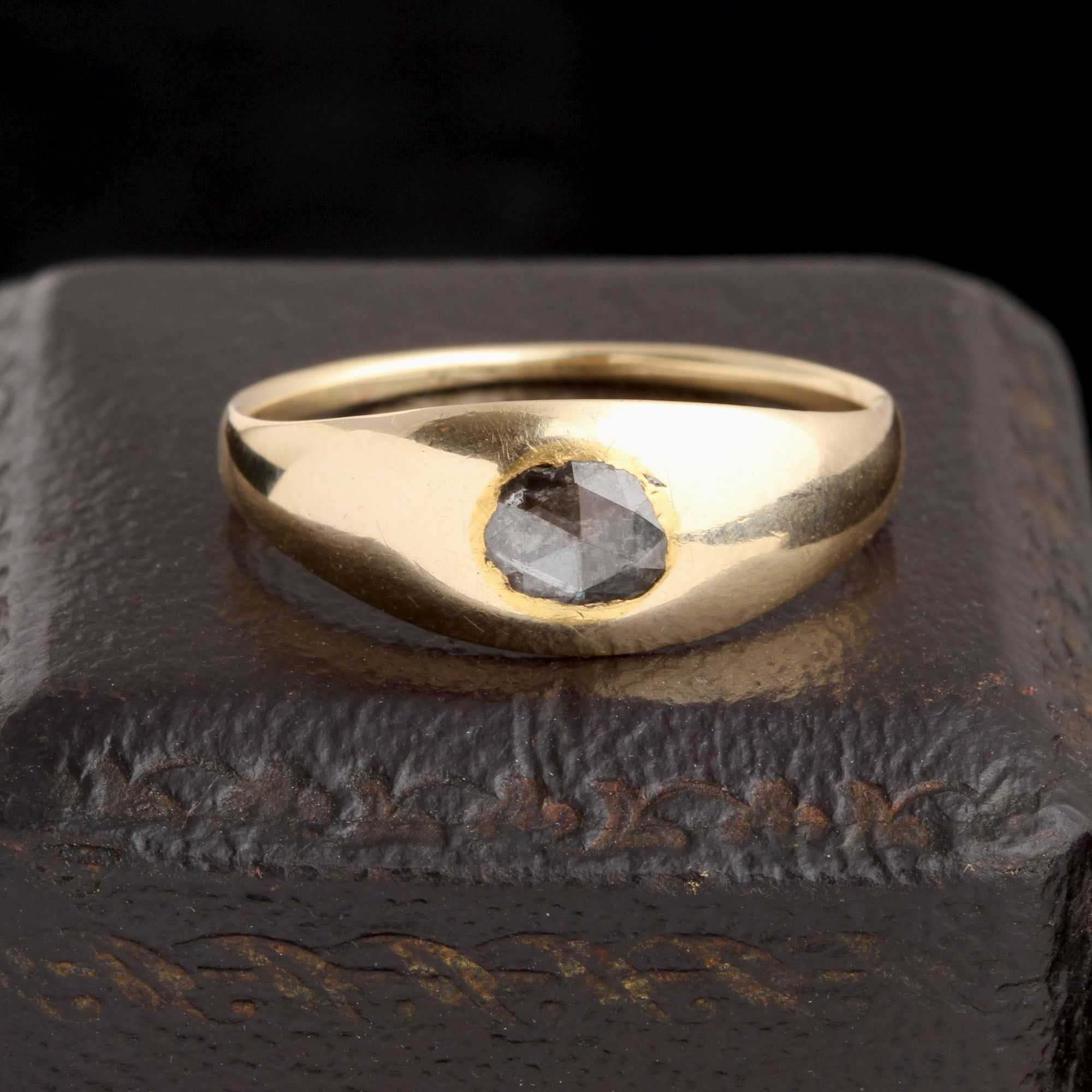 This rose cut diamond is fixed in place using a rub-over setting, a technique that dates back thousands of years. The jeweler literally rubs the metal over the widest part of the stone, hugging it tight. Here, you can see the marks of the maker's hand as he (undoubtedly a he, in 1850) smooshed the gold with slightly irregular pressure. The stone is well protected and there are no prongs to catch on your clothing.